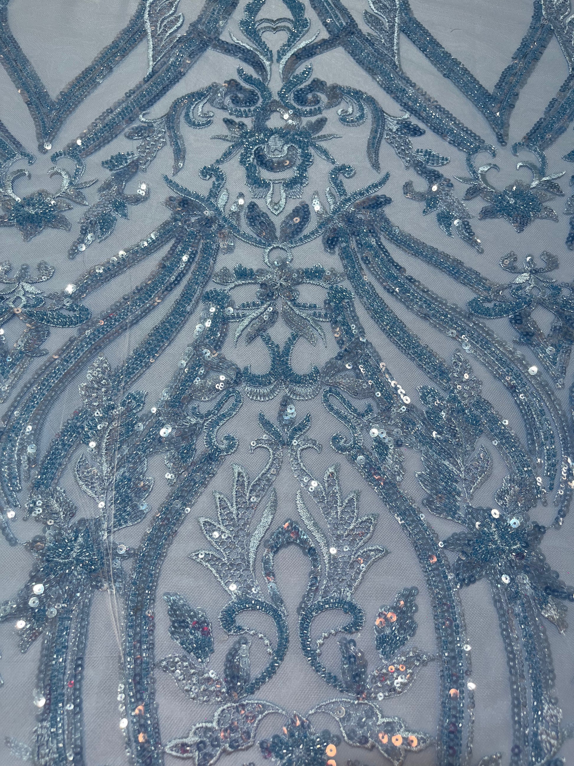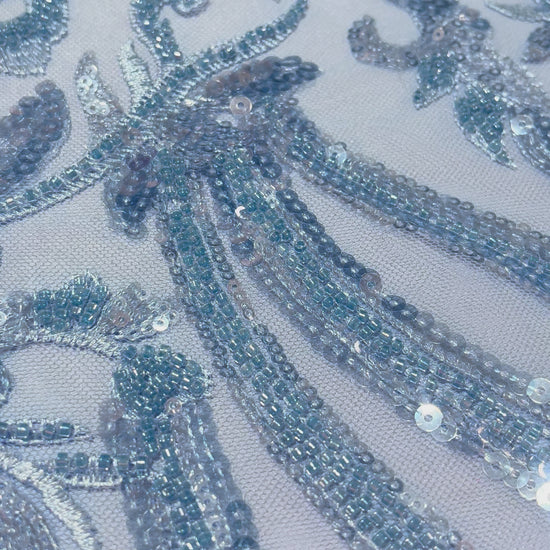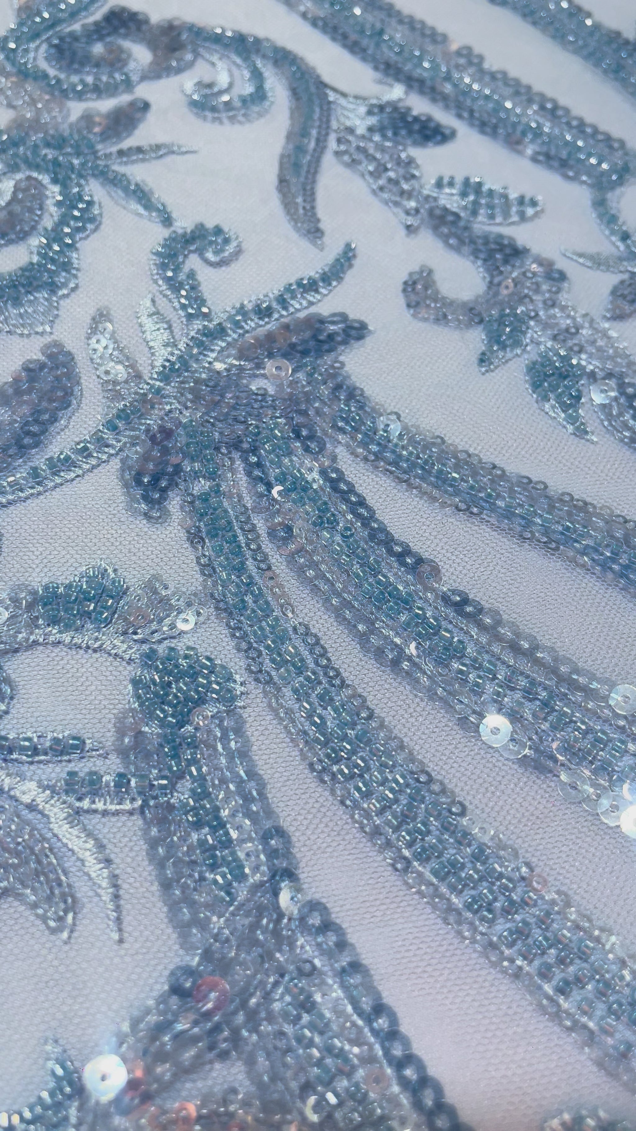 Esta elegante tela combina una base de tul transparente con un intrincado bordado en tono azul, realzado con chaquiras y lentejuelas que reflejan la luz de forma sutil y sofisticada. Su diseño de estilo ornamental aporta un toque de lujo y distinción, ideal para confeccionar vestidos de noche, trajes de gala o prendas para eventos especiales.