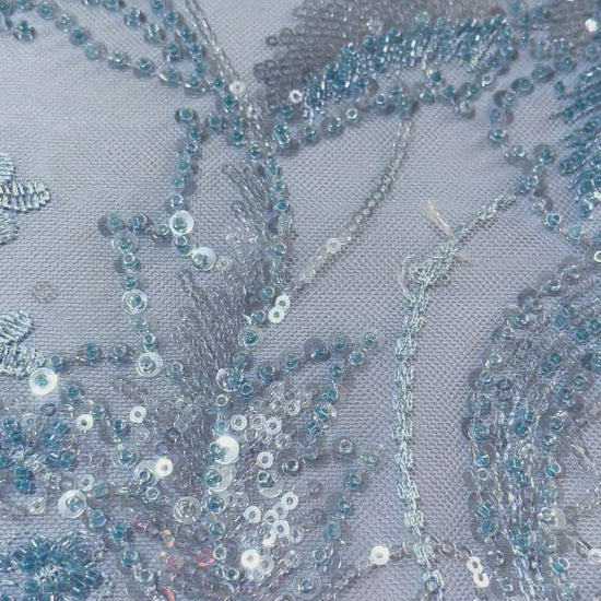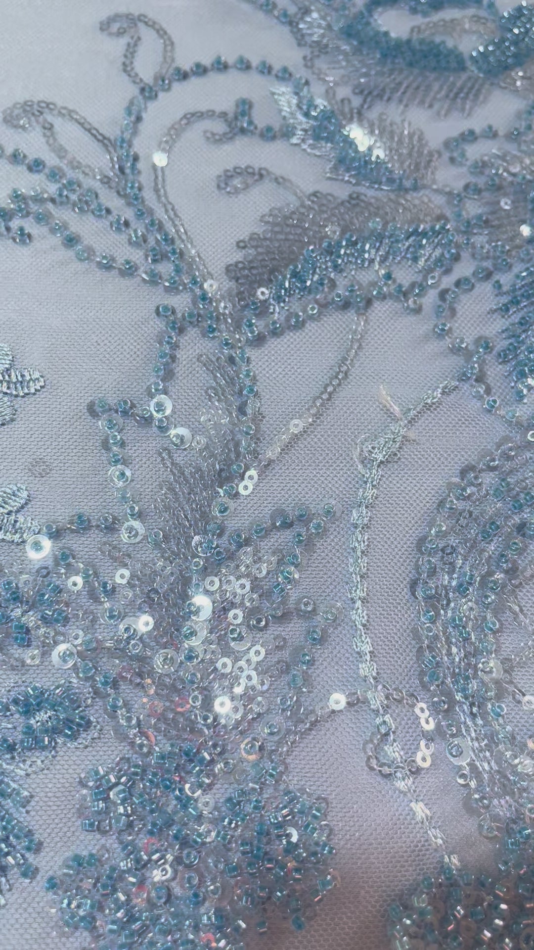 Esta hermosa tela combina elegancia y brillo en un diseño floral bordado sobre tul transparente. Está decorada con chaquiras y lentejuelas en tonos azul claro y plateado, creando un efecto luminoso y delicado que resalta cada detalle del bordado. Ideal para vestidos de noche, quinceañeras, novias o prendas de gala que busquen un toque sofisticado y romántico.