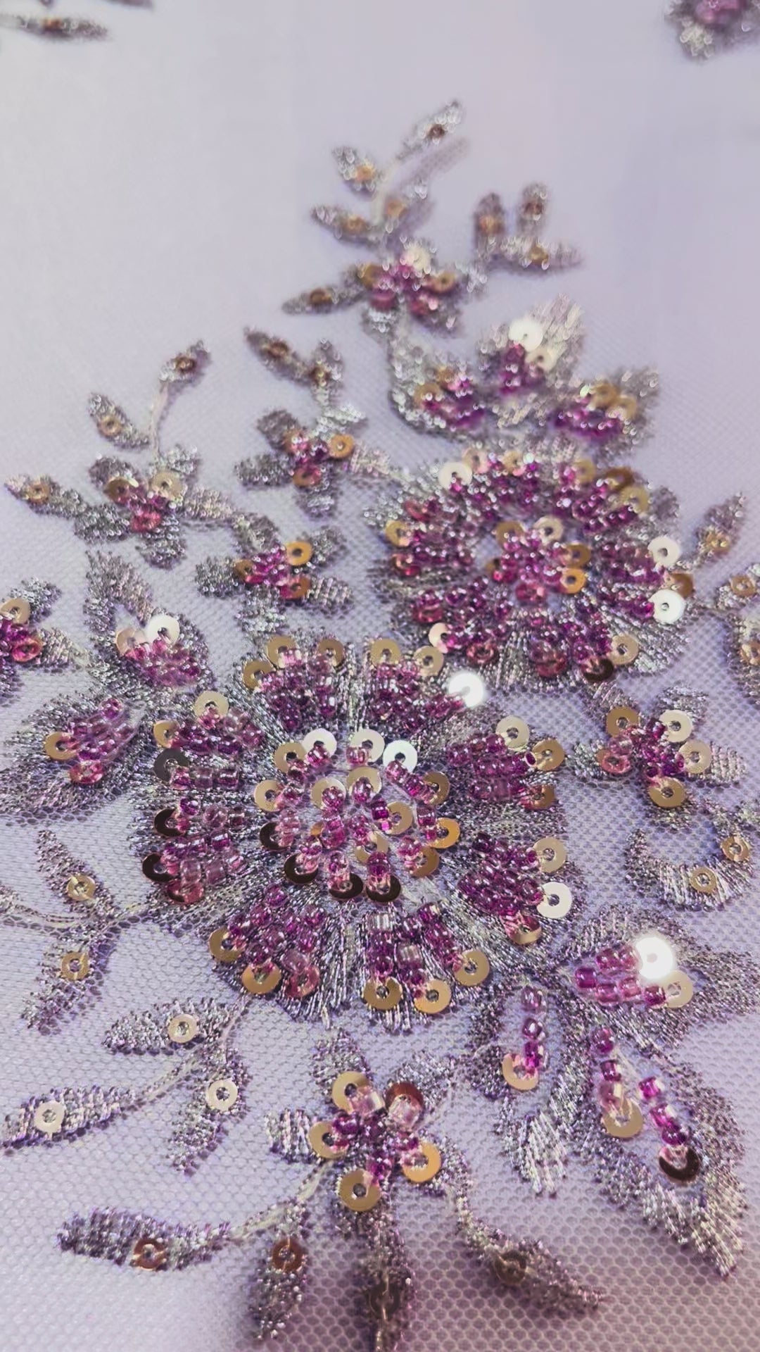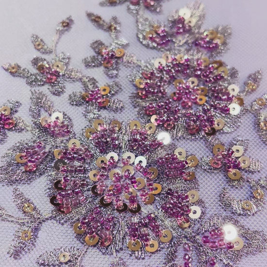 Tul bordado 3D con pedrería en tono lila, diseñado sobre una base de tul suave y semitransparente. Presenta un bordado floral detallado con aplicaciones en relieve que incluyen chaquira, lentejuela y cuentas brillantes. El diseño está distribuido en patrones repetidos y cuenta con una orilla más trabajada, ideal para bastilla o caída del vestido. Es un material elegante y de apariencia refinada, recomendado para confección fina.