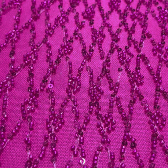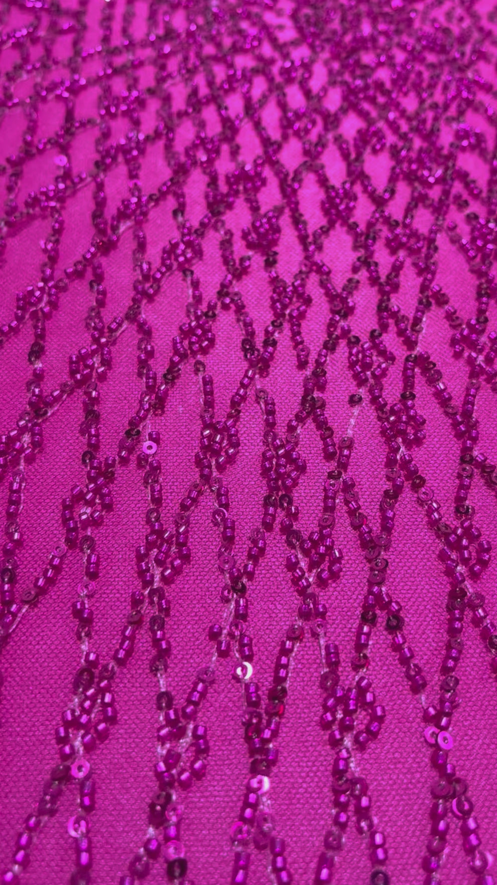 Añade un toque de glamour y elegancia a tus creaciones con esta hermosa tela de encaje adornada con lentejuelas en un vibrante tono rosa.