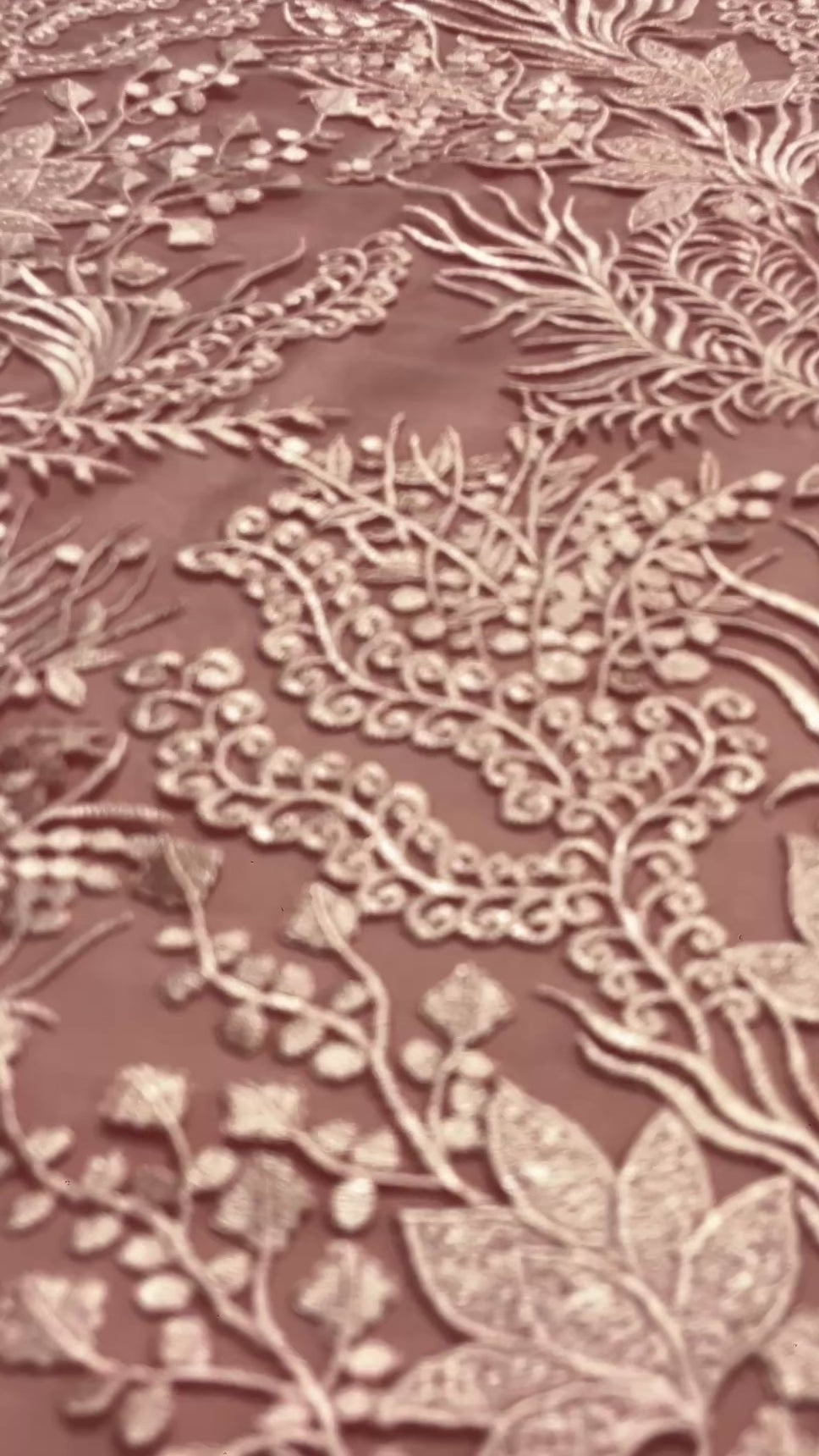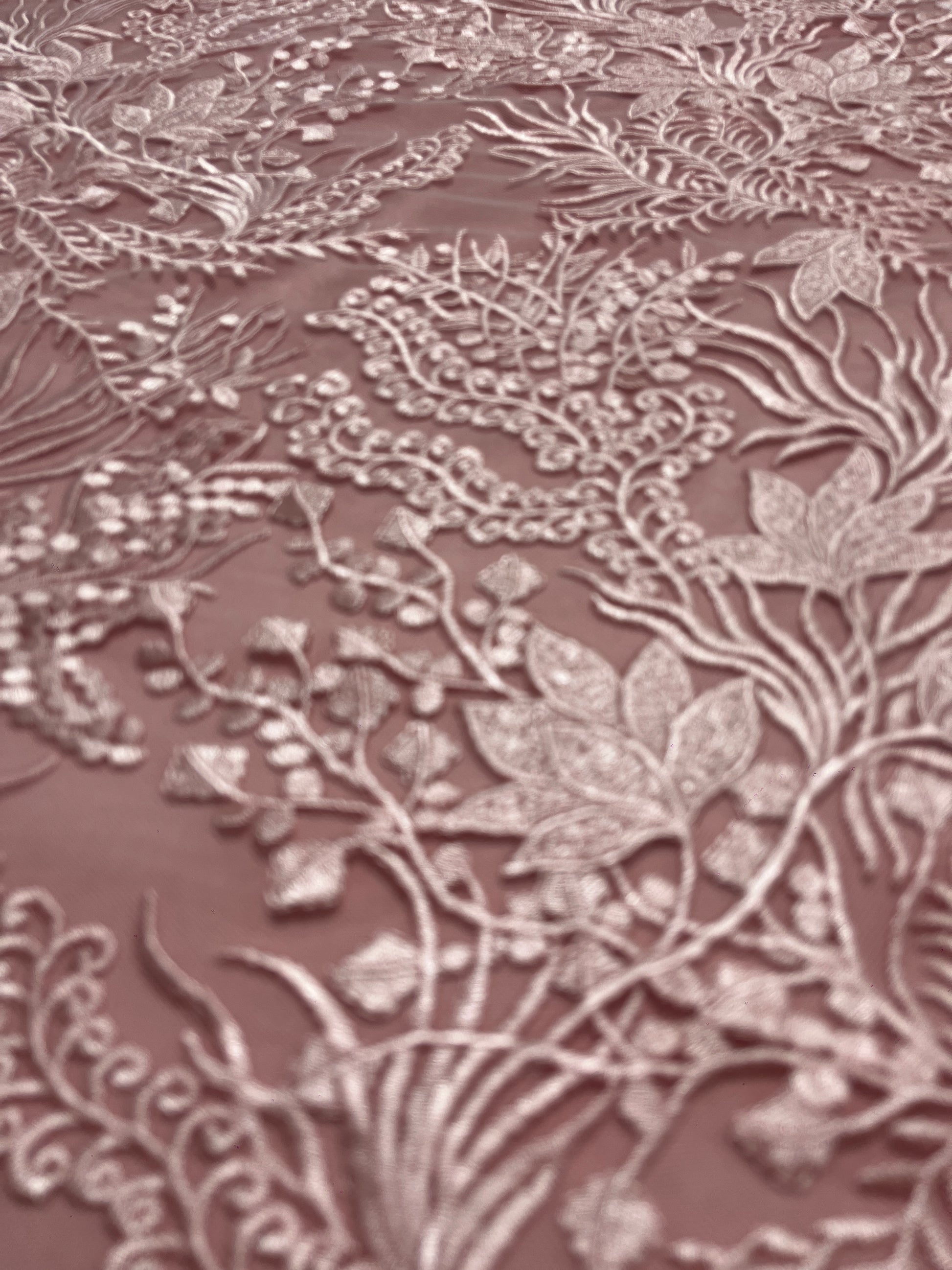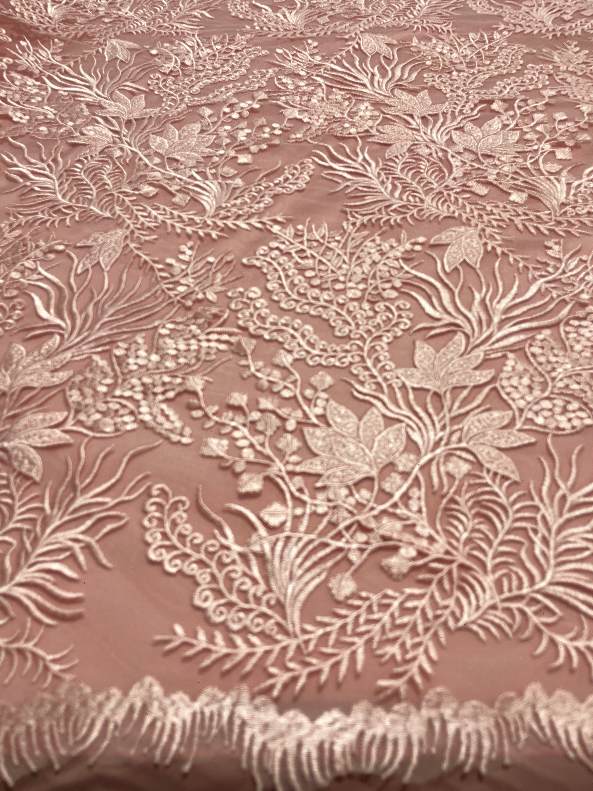 Elegante tela bordada sobre una base de tul suave en tono nude, decorada con delicados motivos florales y follaje en hilo marfil. Su diseño presenta un bordado detallado y continuo, con relieves sutiles que aportan profundidad y un acabado refinado. El contraste suave entre la base y el bordado realza la riqueza del dibujo, logrando una apariencia atemporal y sofisticada.
