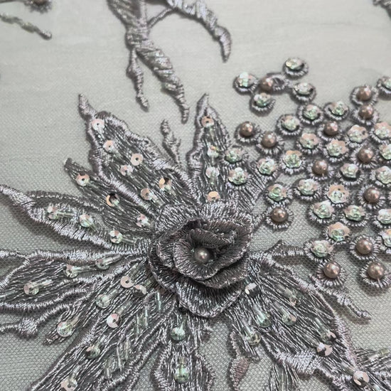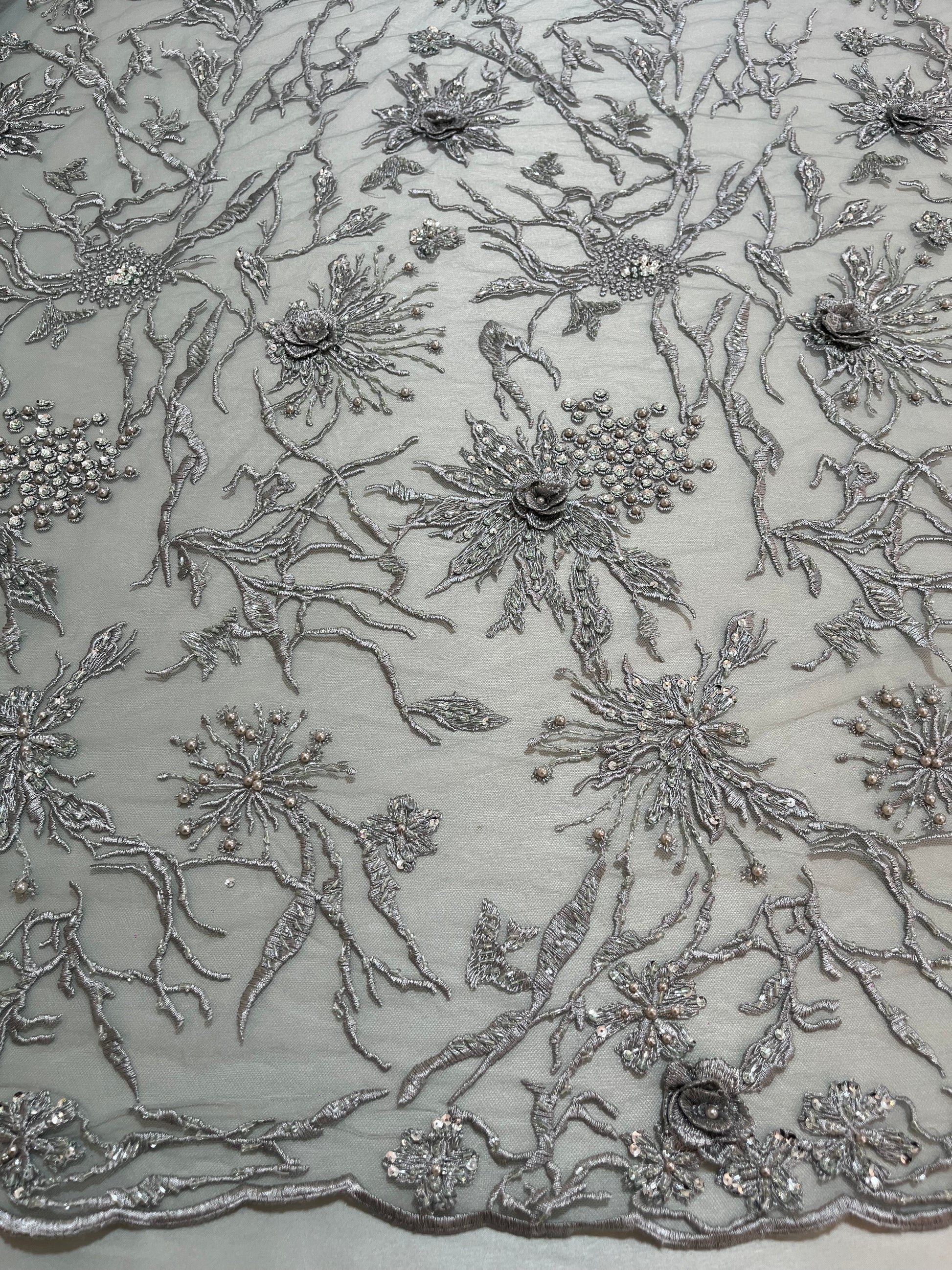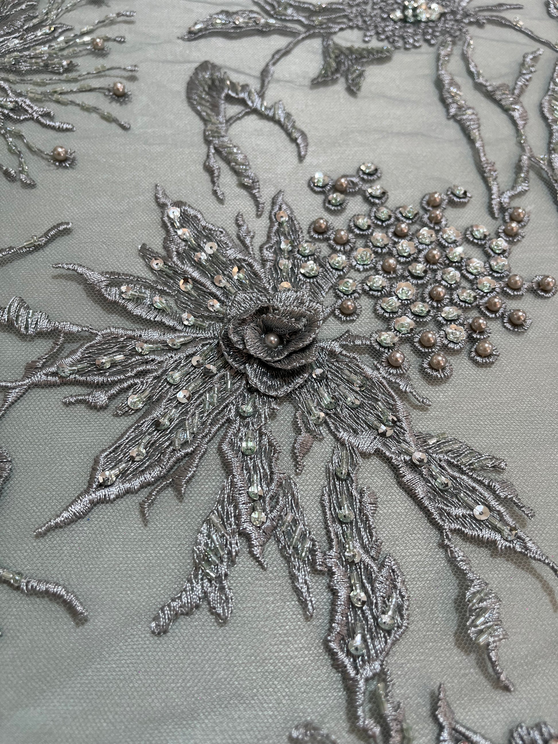 Tela en base de malla fina con bordado contemporáneo en tonos plata, destacando flores con volumen y detalles tridimensionales. El diseño combina hilo satinado, aplicaciones de lentejuelas, cristales y perlas en puntos estratégicos, lo que crea un acabado sofisticado y elegante con presencia visual y textura destacada.