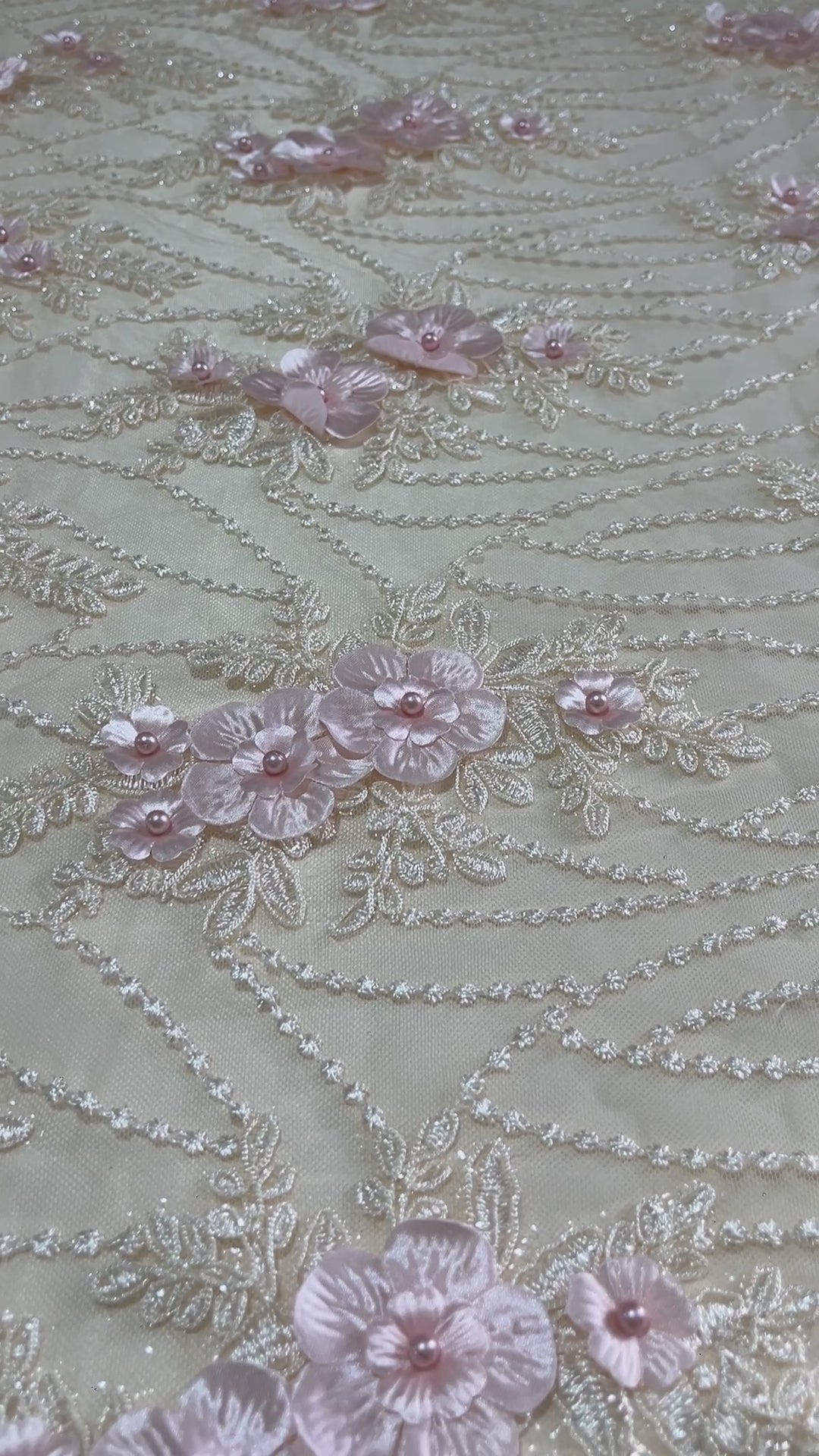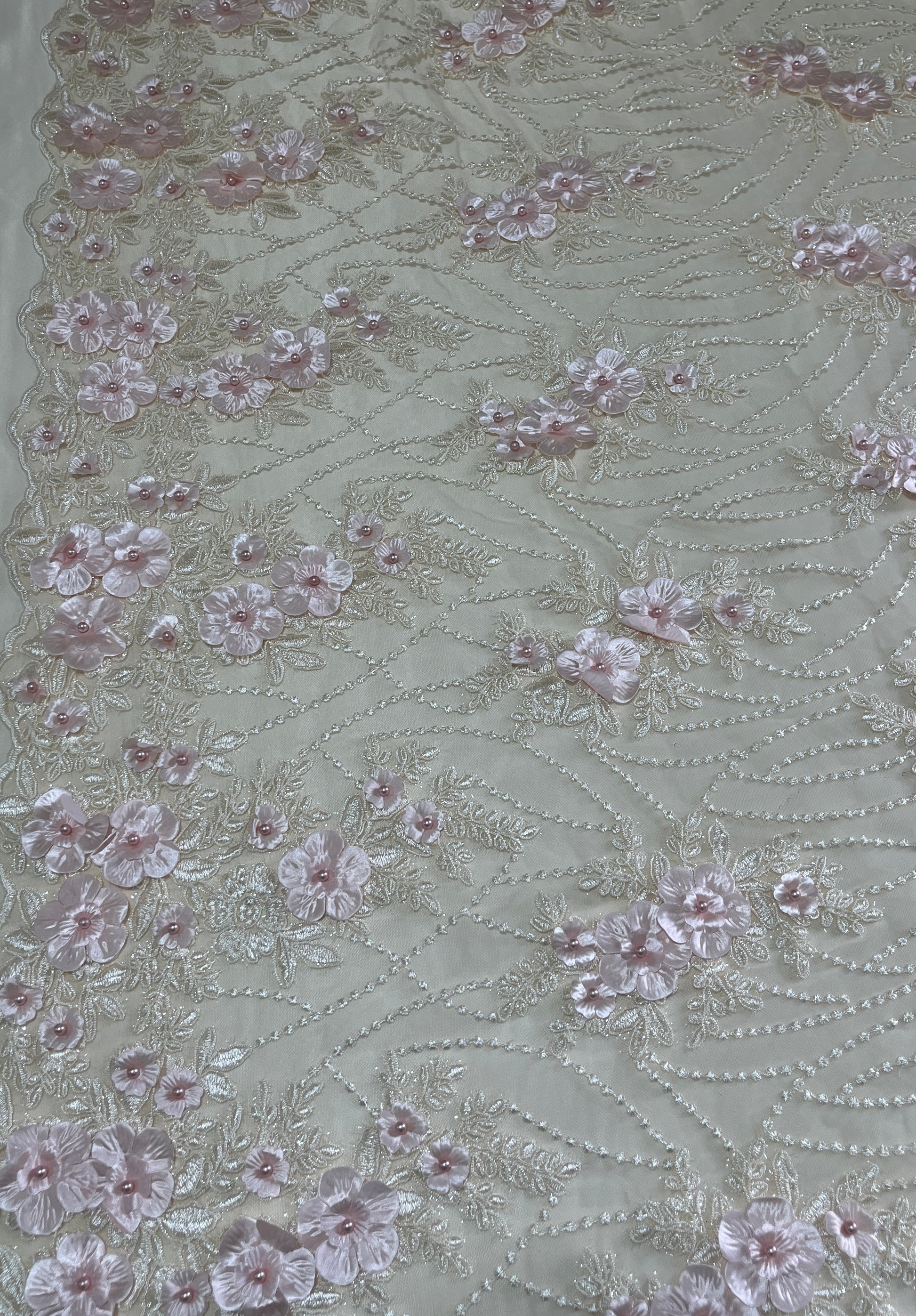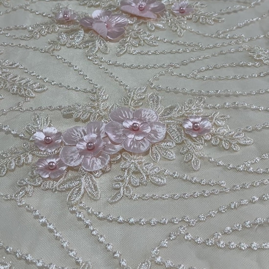 Espectacular encaje bordado sobre base de tul fino, decorado con flores 3D en relieve y delicados detalles de perlas que aportan profundidad, textura y un acabado artesanal de lujo. Su diseño floral distribuido de forma armoniosa crea un efecto romántico y sofisticado, perfecto para piezas protagonistas y confecciones exclusivas.