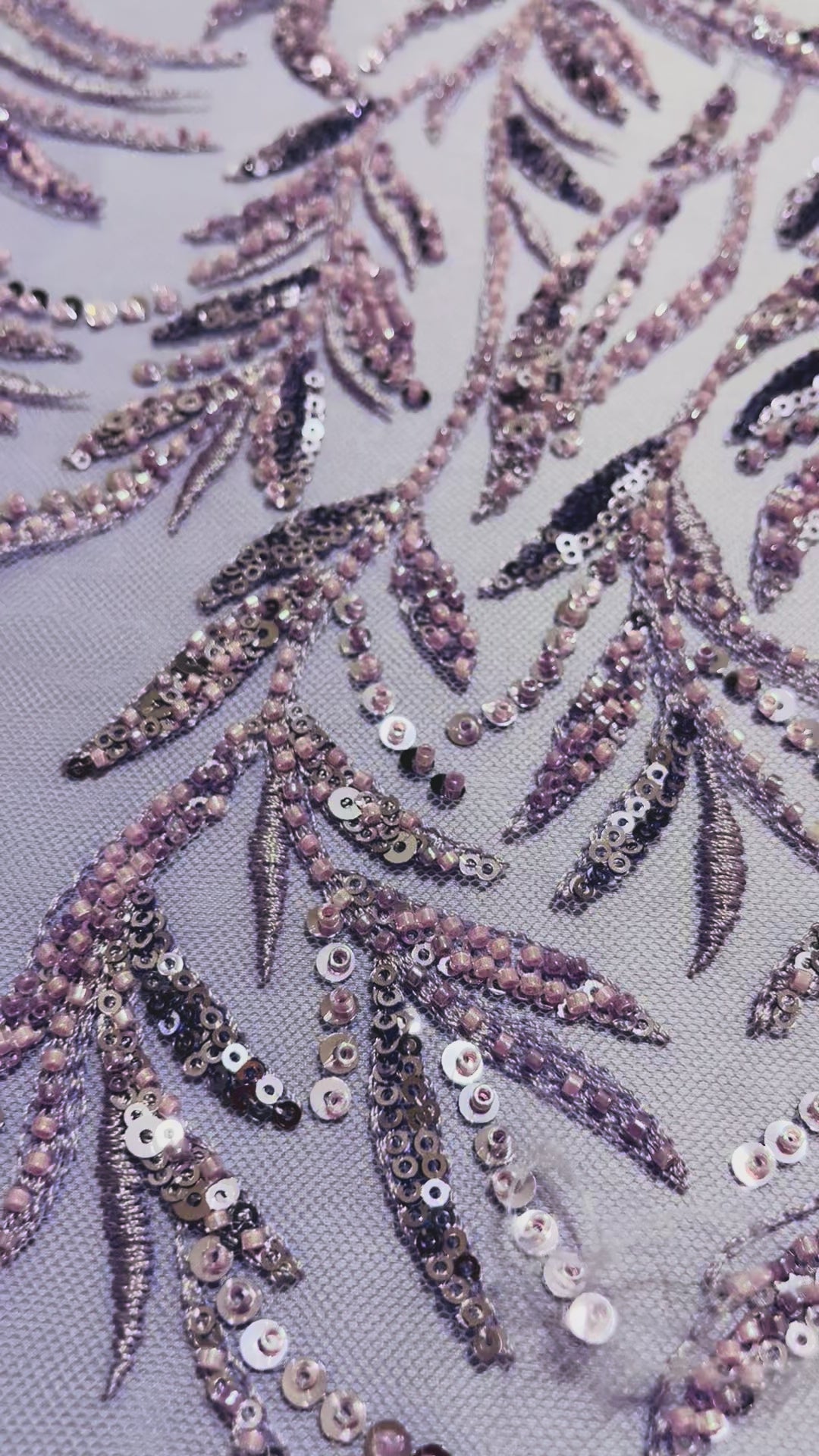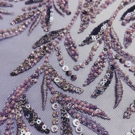 Tul bordado con lentejuelas en tono lila, inspirado en un diseño orgánico con motivos que simulan hojas estilizadas. El patrón está distribuido sobre una base de tul suave y semitransparente, donde las aplicaciones de lentejuela generan un brillo uniforme y elegante. Es un tejido moderno, sofisticado y con buena caída, ideal para confección fina y vestidos con acabado visual llamativo.