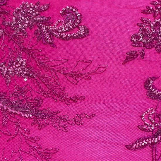 Tela magenta con bordados florales intrincados hechos con hilo oscuro y adornados con lentejuelas brillantes que le dan un toque elegante y sofisticado