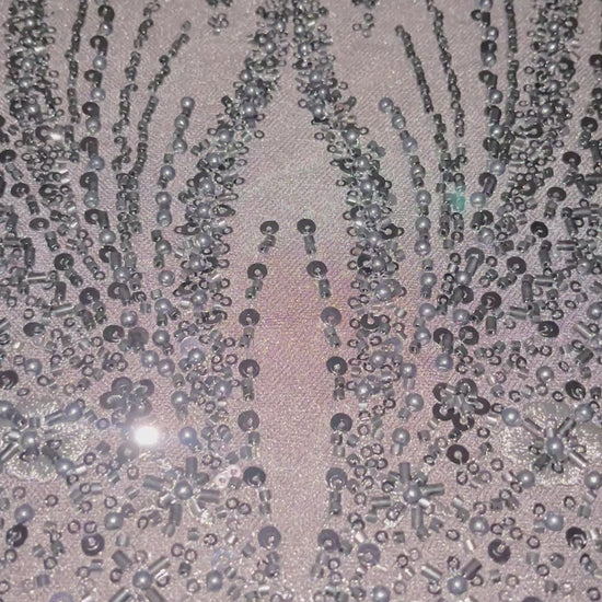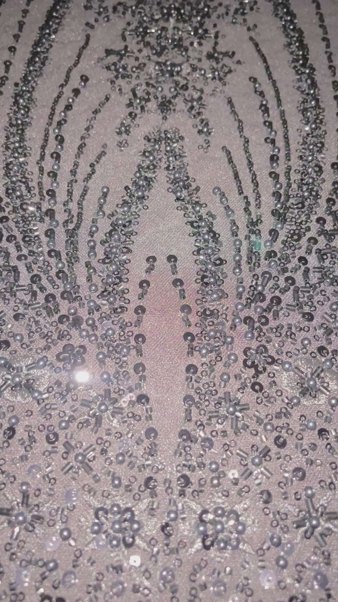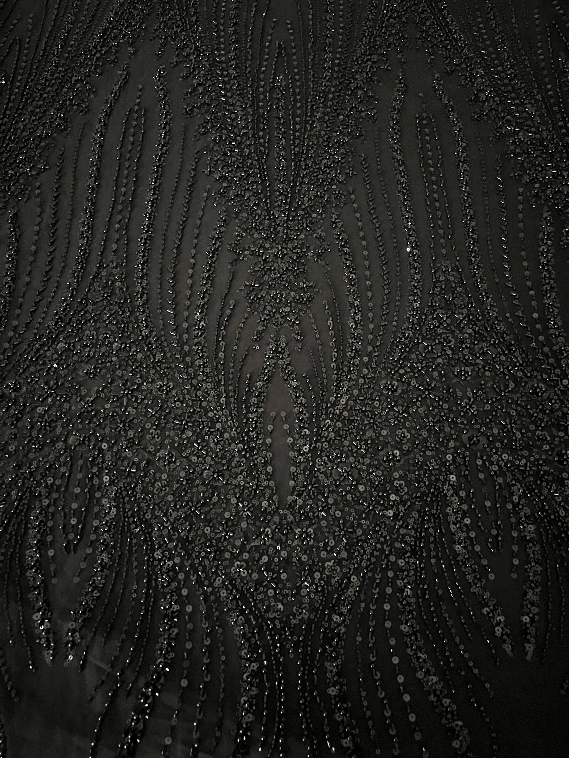 Tela sofisticada elaborada sobre una base de tul negro, finamente bordada con pedrería y chaquira en tonos negros. Su diseño presenta un patrón ornamental de inspiración clásica con líneas fluidas y detalles brillantes que aportan profundidad, textura y un acabado de alto lujo.