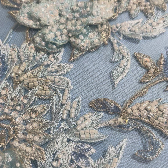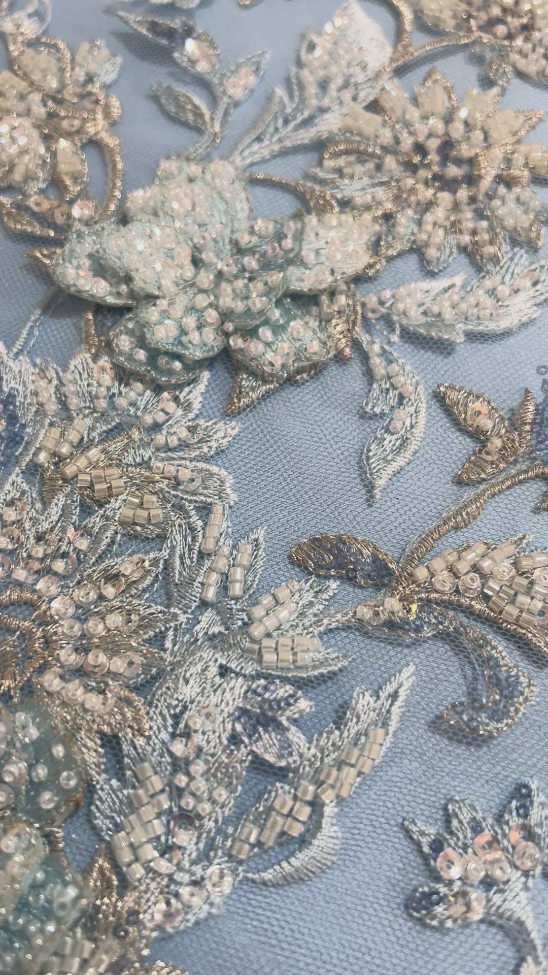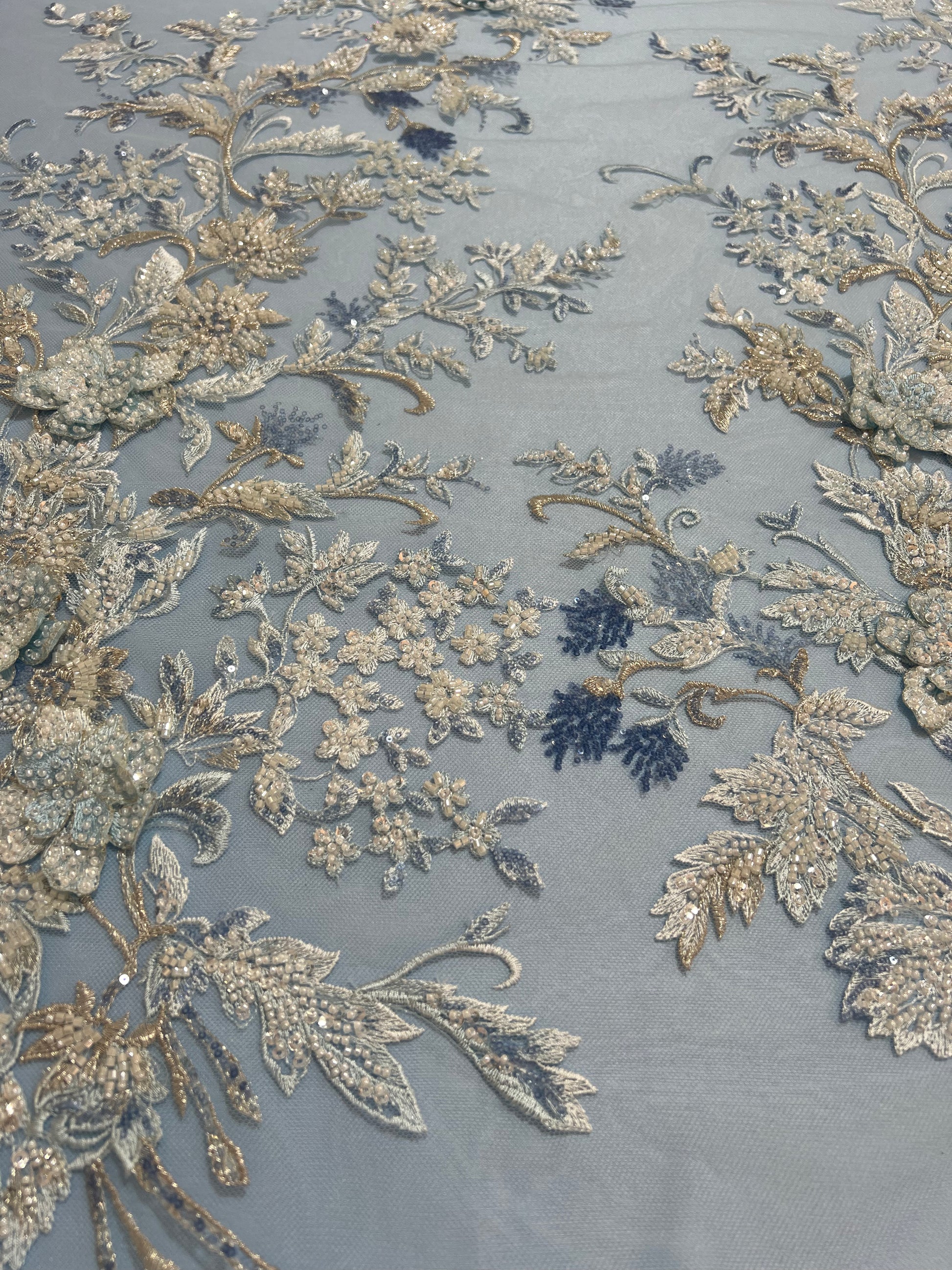 Una pieza elegante y sofisticada que combina una base de tul azul con un bordado floral en hilos dorados y azules, realzado con chaquiras, lentejuelas y perlas que aportan brillo y textura. El diseño presenta flores y hojas delicadamente elaboradas que crean un efecto tridimensional, ideal para vestidos de gala, novia, noche o trajes de alta costura.