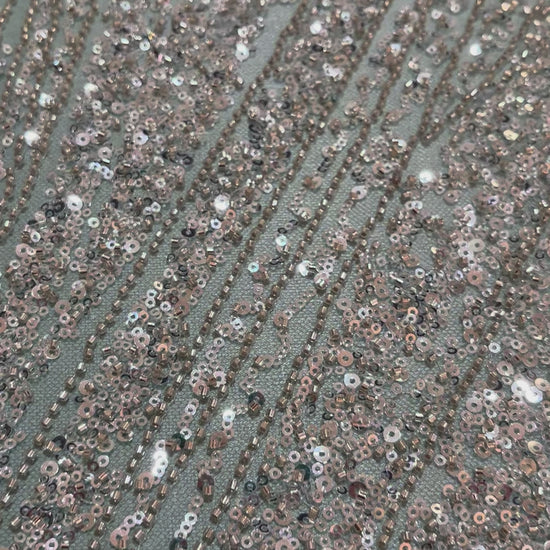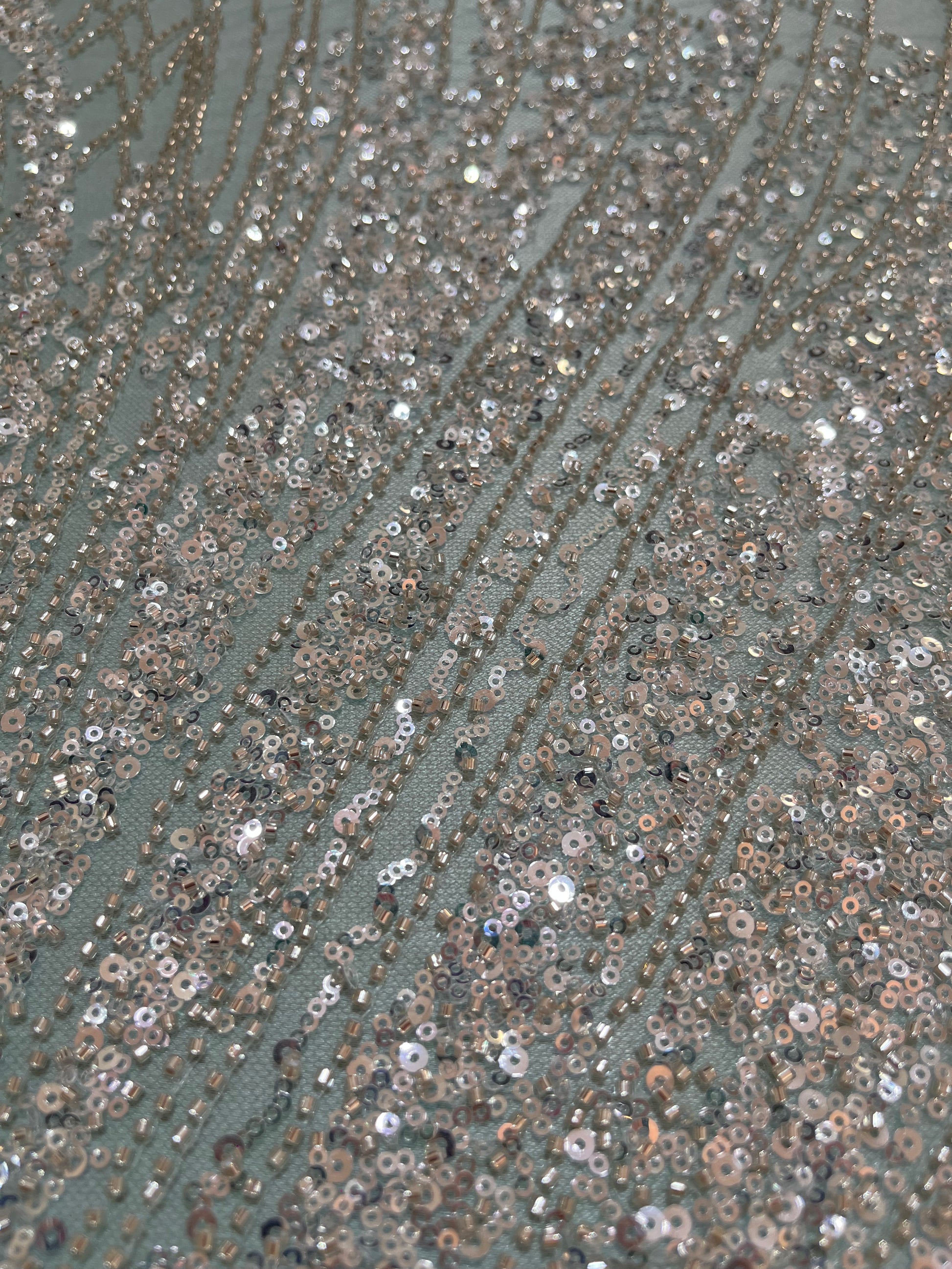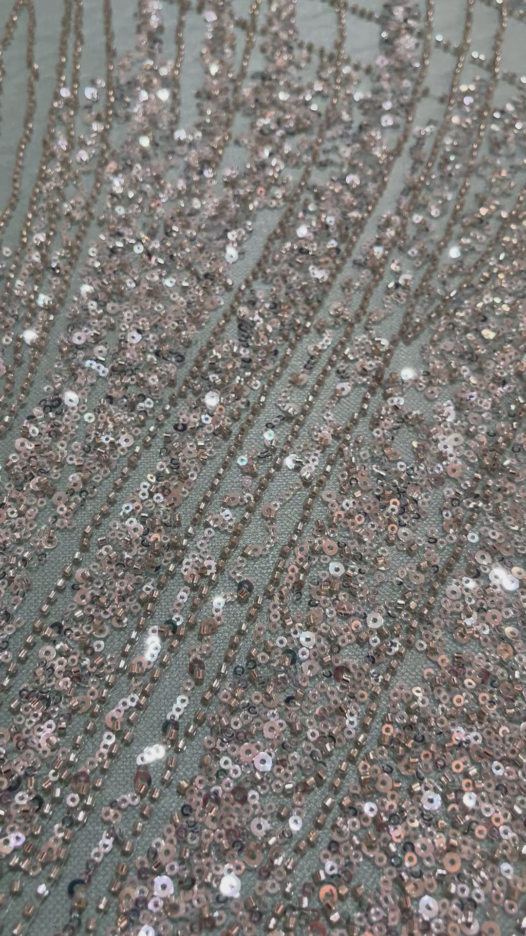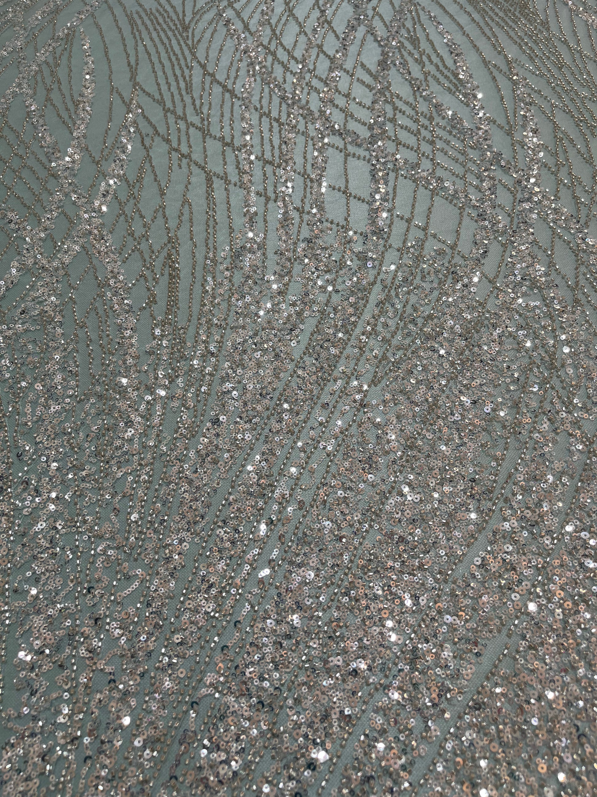 Tela con base de malla fina y aplicación completa de lentejuela y canutillo distribuidos en patrones lineales ondulados. El diseño crea un efecto visual moderno con brillo uniforme y elegante, ideal para prendas con caída fluida y piezas de moda con acabado llamativo.