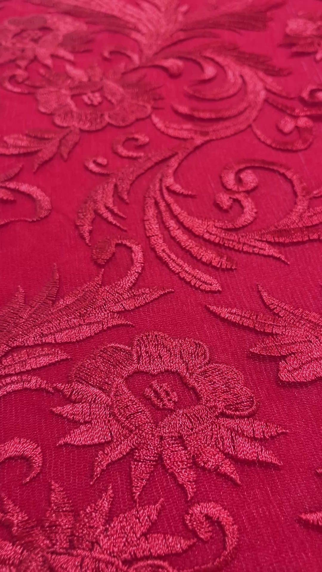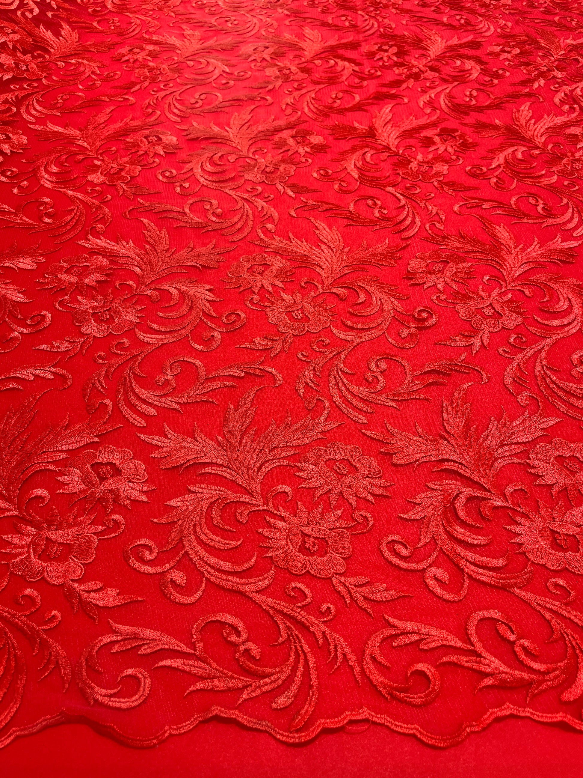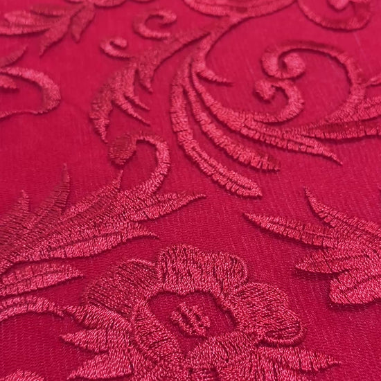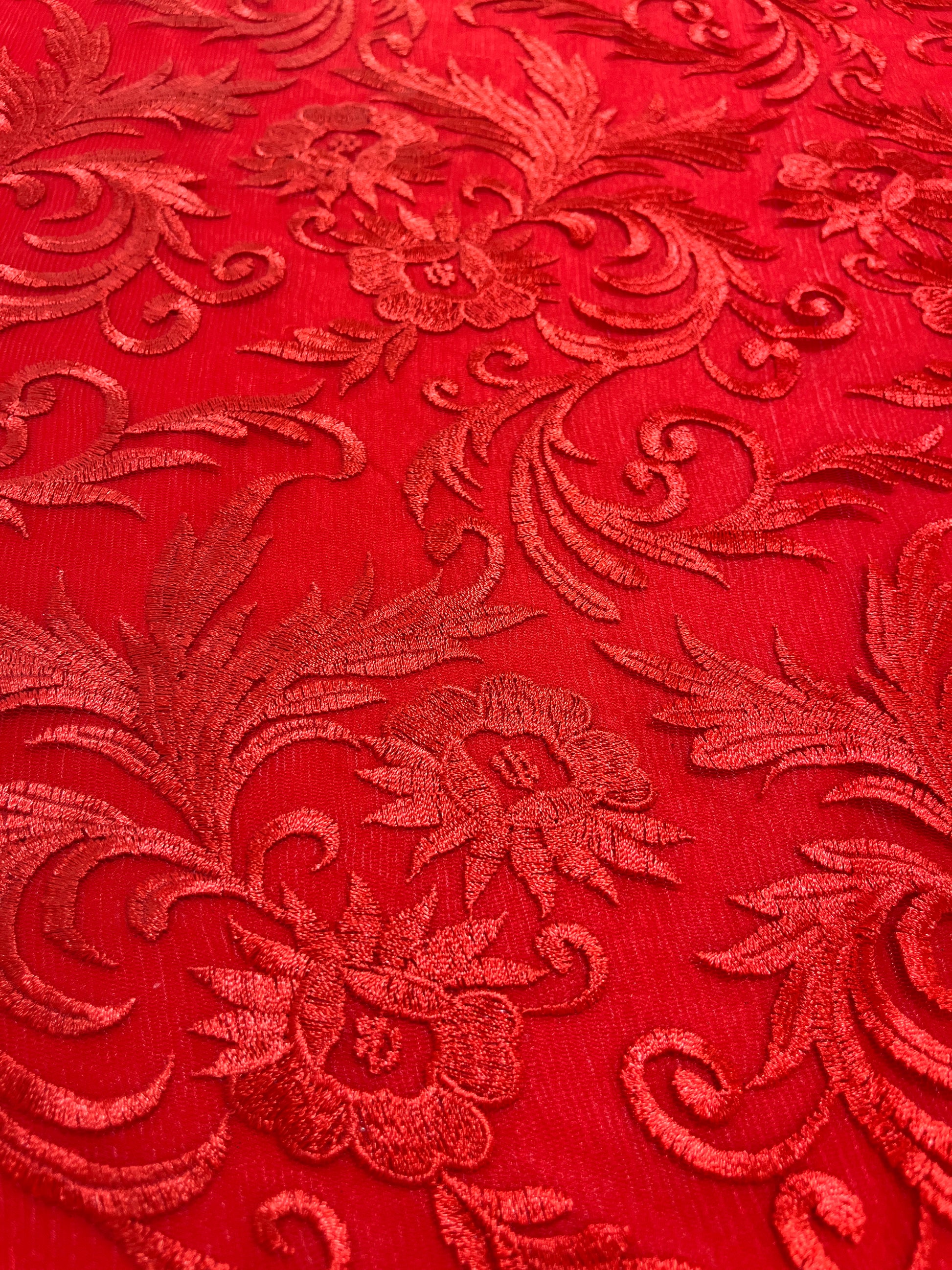Tela elegante tipo jacquard en color rojo clásico, con un delicado diseño floral y arabescos en relieve que aportan textura y sofisticación. Su patrón ornamental de inspiración clásica crea un acabado refinado y atemporal, ideal para prendas y proyectos decorativos que buscan un estilo distinguido.