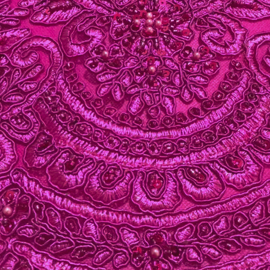 •⁠  ⁠Tela magenta con bordados florales oscuros y lentejuelas brillantes.