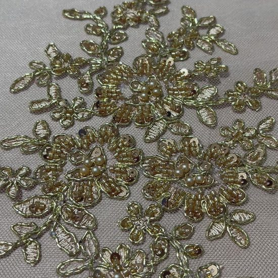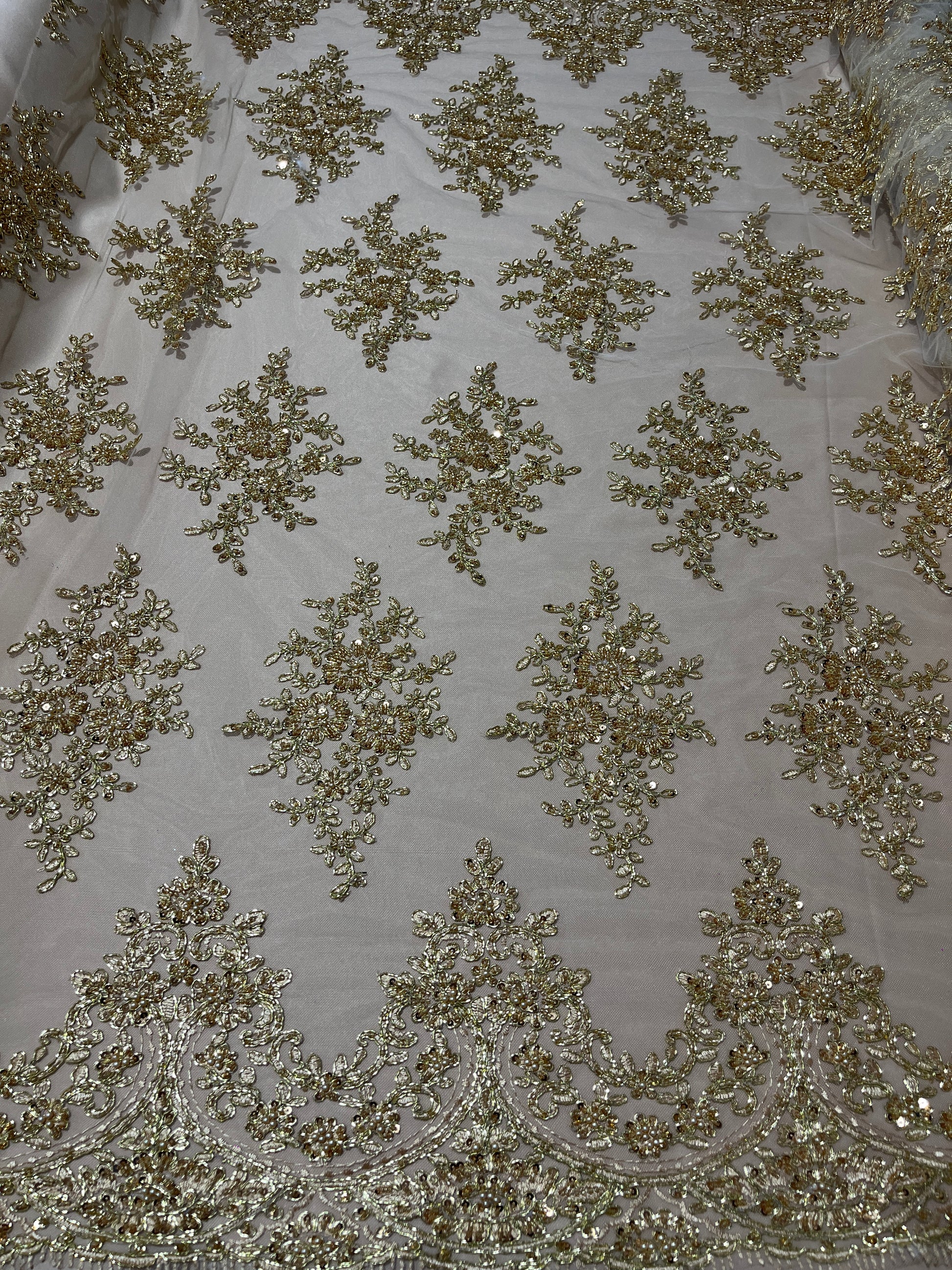 Esta sofisticada tela de tul fino presenta un delicado bordado en hilo dorado con aplicaciones de lentejuela y pedrería que forman motivos florales distribuidos de manera uniforme. En la parte inferior destaca una elegante cenefa ornamental tipo encaje, ideal para crear terminaciones de alto impacto visual sin necesidad de aplicaciones adicionales.
