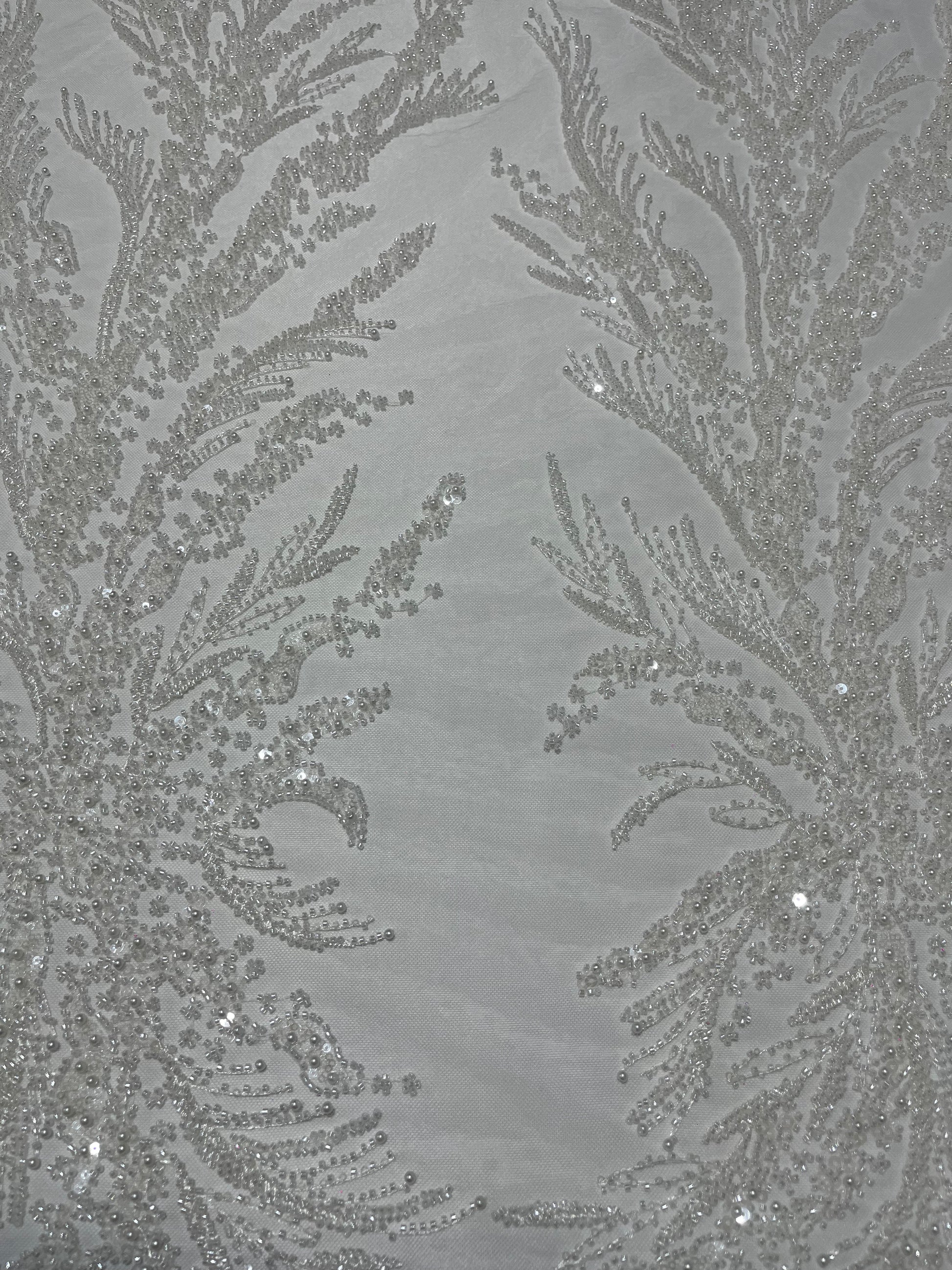 Esta tela de lujo destaca por su base de tul transparente adornada con un elegante bordado en forma de ramas, finamente trabajado con chaquiras, lentejuelas y pequeñas perlas en tono ivory. Cada detalle refleja la luz con un brillo sutil, aportando un efecto etéreo y sofisticado ideal para confeccionar vestidos de novia, velos o prendas de gala.