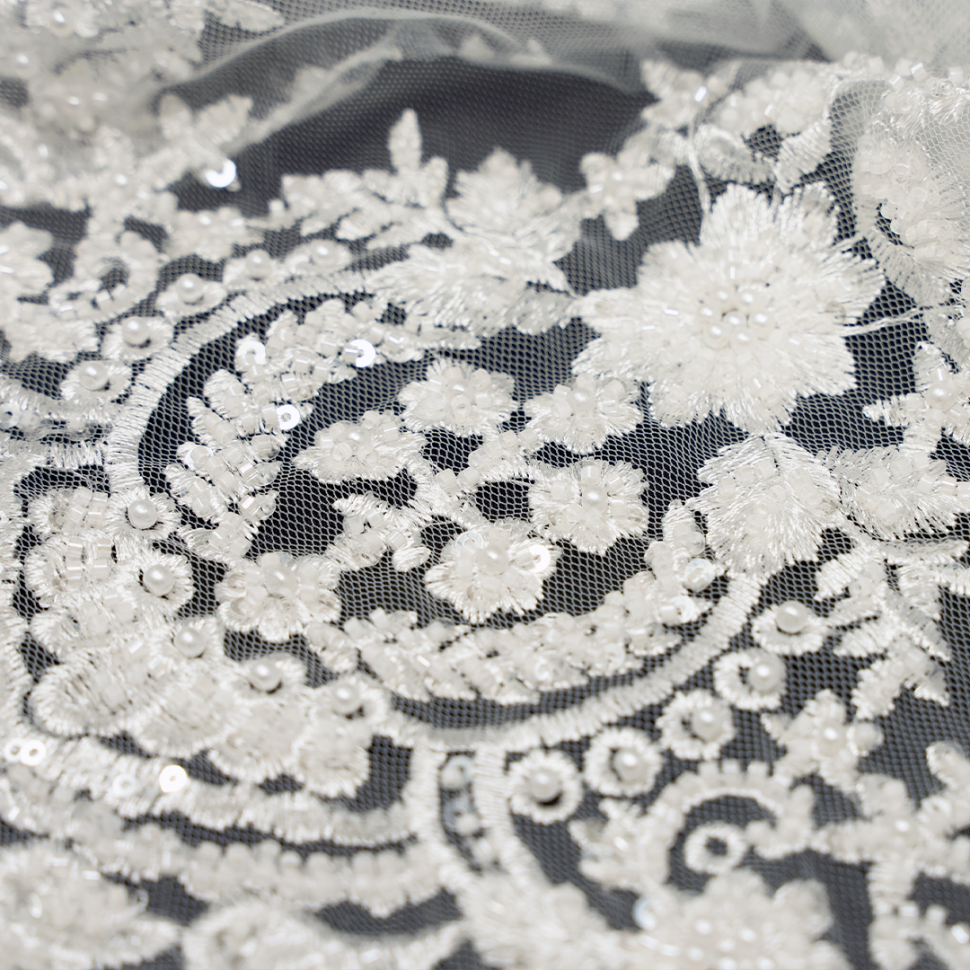 El tul bordado 3D es un tejido delicado y sofisticado, ideal para confeccionar vestidos de alta costura. Su diseño con pedrería hexagonal añade un efecto de volumen y brillo sutil, realzando cualquier creación. Con un ancho de 132 cm y un peso de 300 g/m², esta tela combina ligereza y estructura, perfecta para piezas exclusivas con un acabado elegante y refinado.