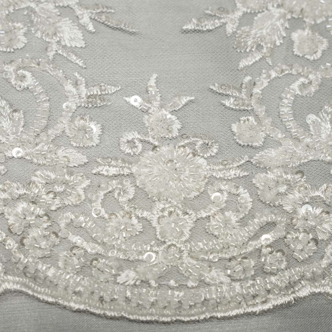 Tela ideal para confeccionar vestidos de alta costura. Su diseño 3D de pedrería con picos triple con perlitas añade un efecto de volumen y brillo sutil, realzando cualquier creación. Con un ancho de 132 cm y un peso de 180 g/m², esta tela combina volumen y estructura, perfecta para piezas exclusivas con un acabado elegante y refinado.