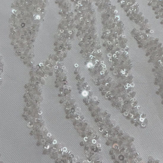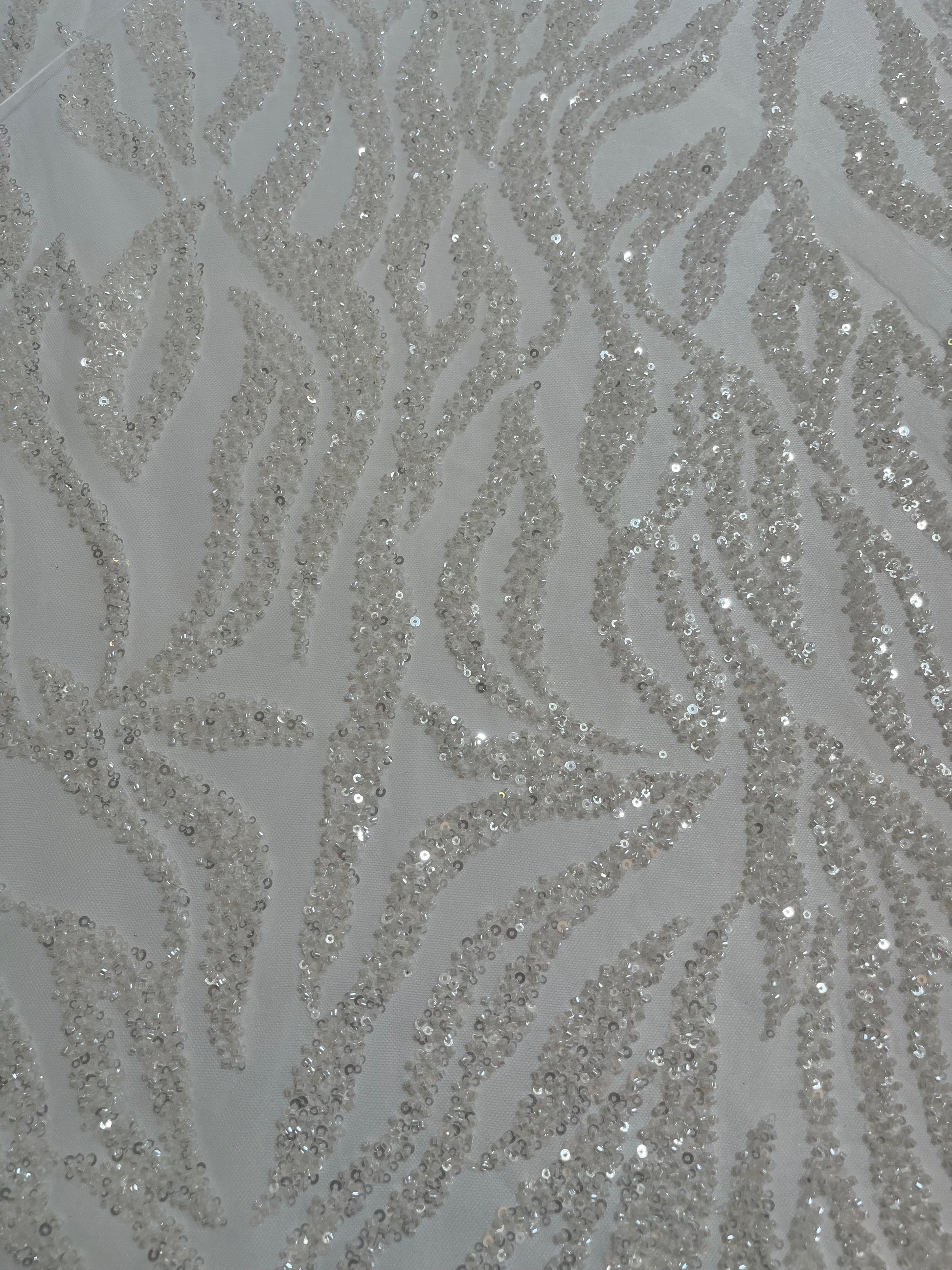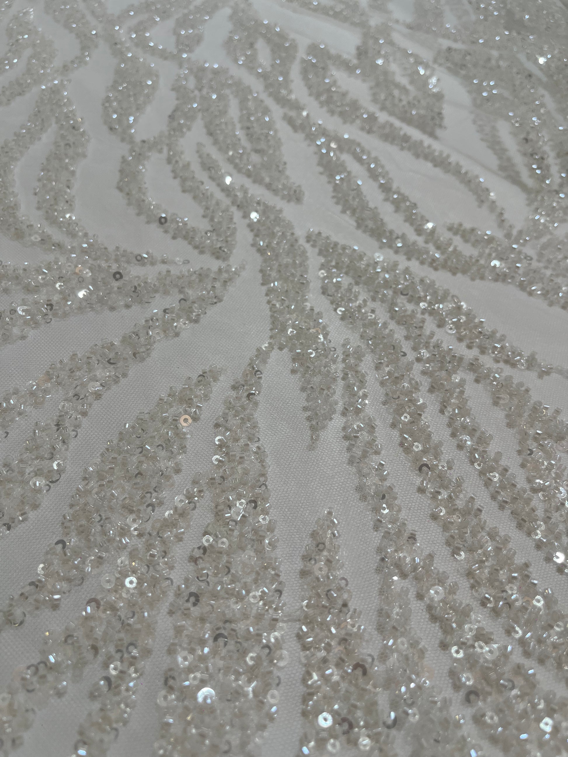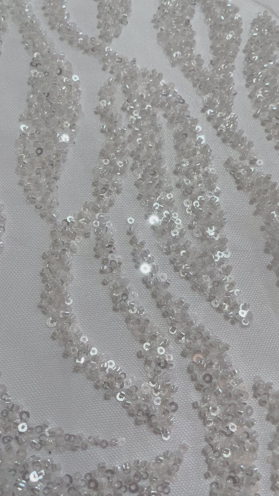 •⁠  ⁠Decoración: Decorado con lentejuelas y chaquiras plateadas o gris claro en un patrón de líneas curvas que se asemejan a plumas o rayos.