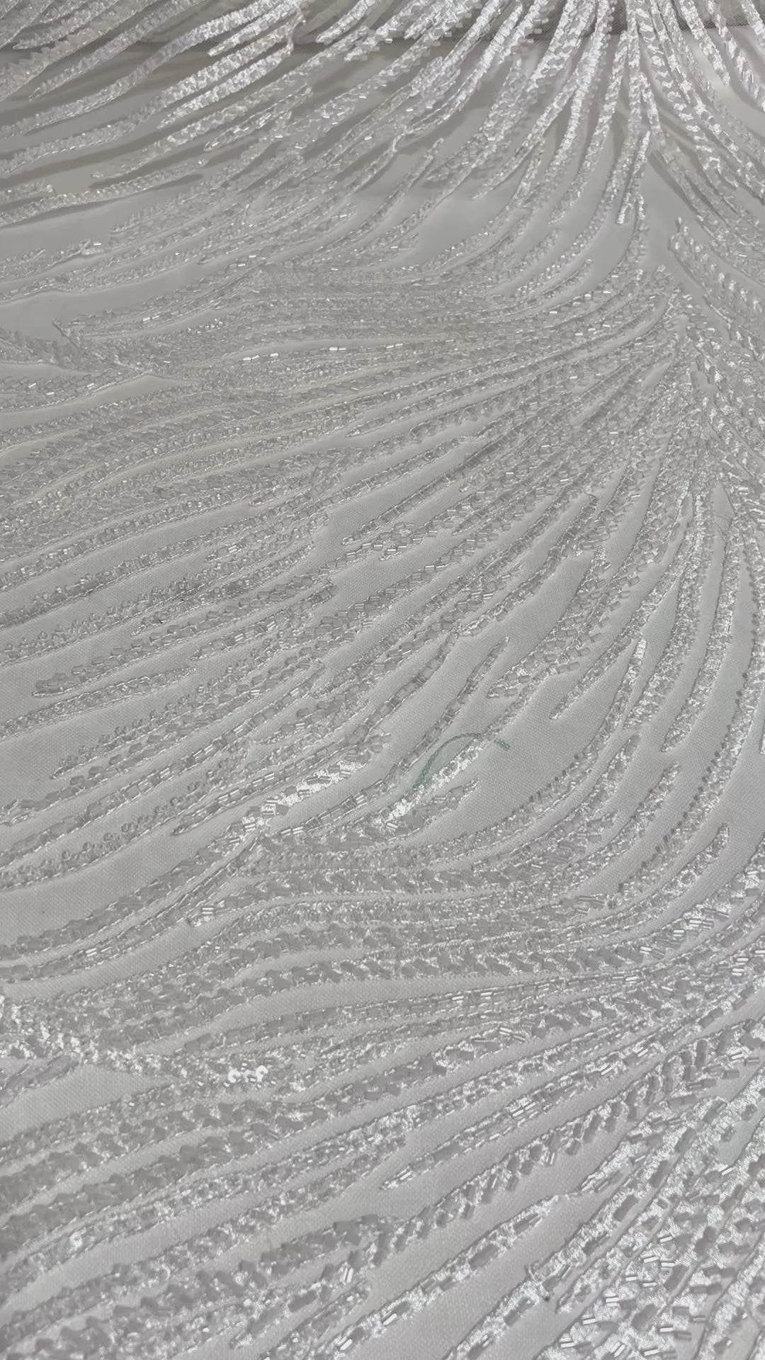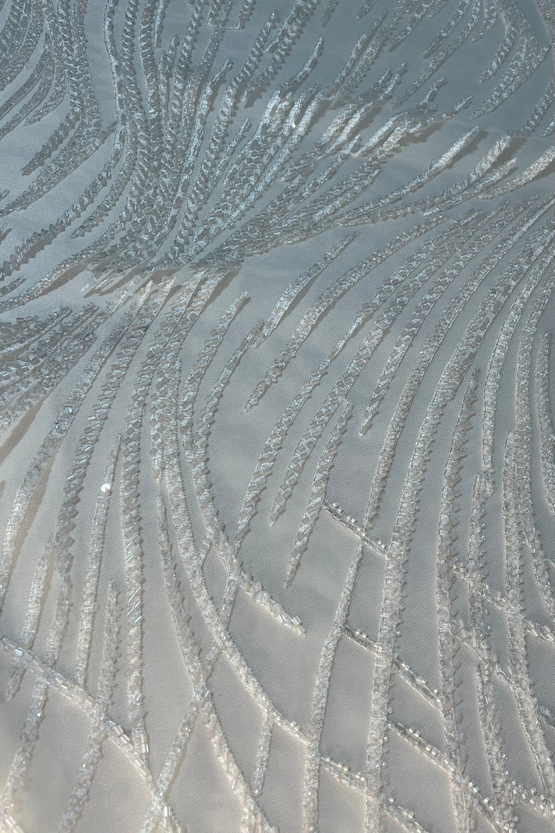 Tul bordado de chaquira y lentejuelas en patrón de líneas curvas que crean un efecto moderno y sofisticado. Su brillo sutil y su textura ligera la hacen perfecta para confeccionar vestidos de novia, prendas de gala o piezas de alta costura que buscan elegancia y movimiento.